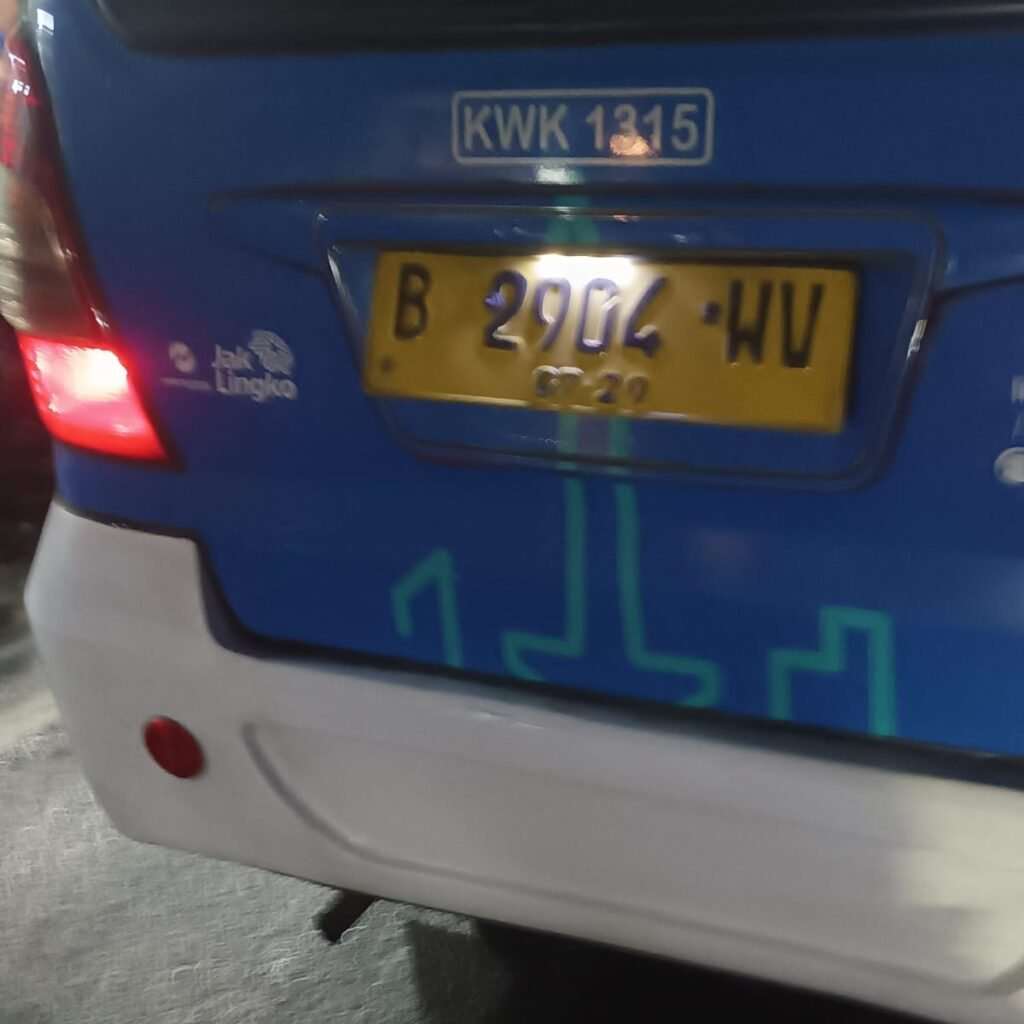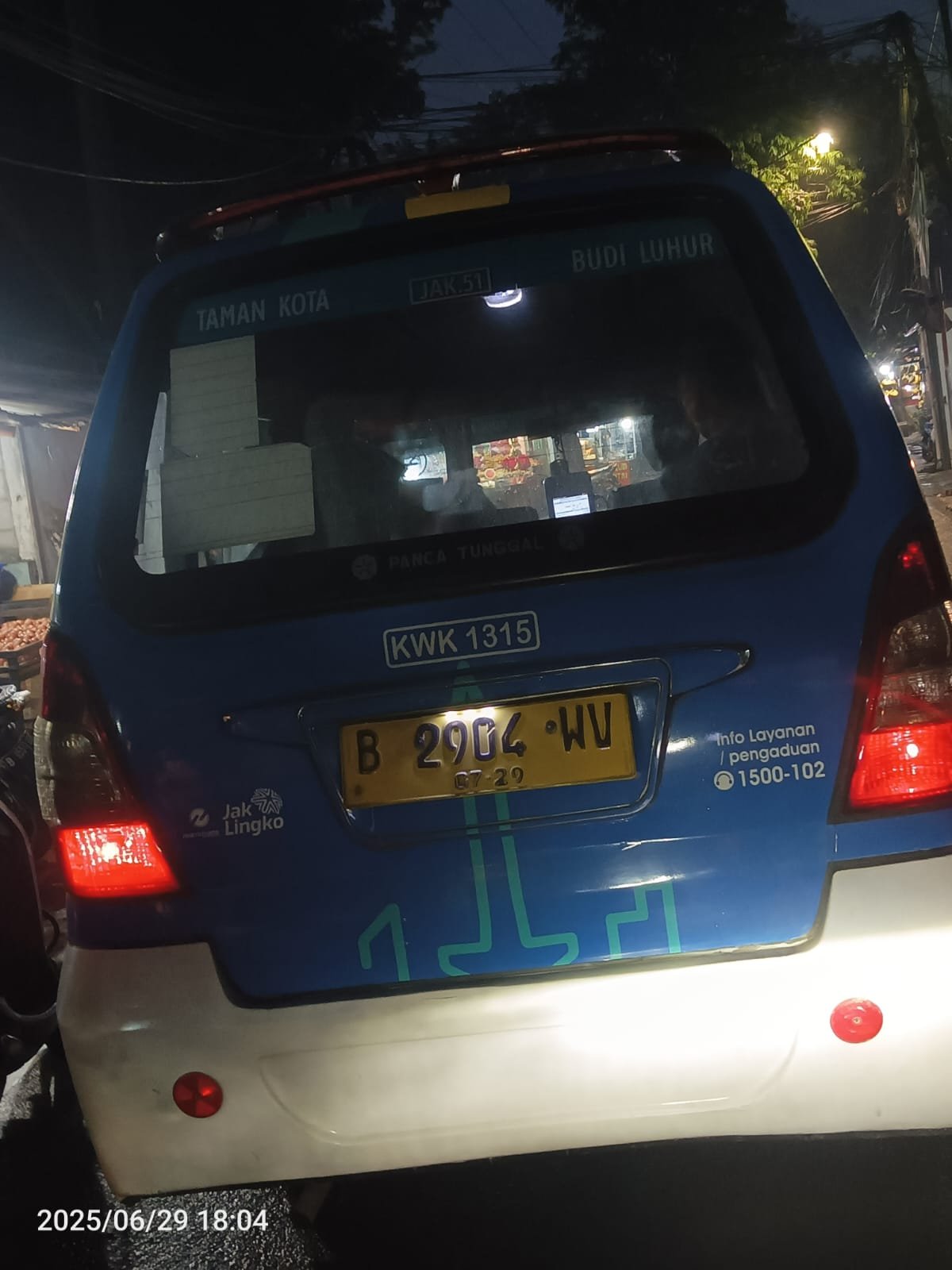 Sebuah angkot Jaklingko dengan nomor seri B 2904 WV, dengan trayek KWK 1315 jurusan Taman Kota, mengemudi secara ugal-ugalan di Jalan Mochtar Raya pada hari Minggu, 29/06/2025 pukul 18.04 WIB.